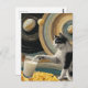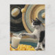 AI generated art of an adorable cat with a glass of milk on a planet made of macaroni surreal retro collage art