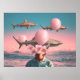 A whimsical scene features sharks swimming among pink balloons, with a figure partially obscured by flowers in the foreground. The background shows a vibrant seascape under a clear sky.