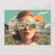 A woman wearing sunglasses with surreal landscapes reflected in the lenses stands before a bright backdrop. The scene combines different elements from architecture and nature.