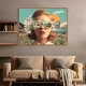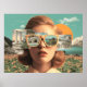 A woman wearing sunglasses with surreal landscapes reflected in the lenses stands before a bright backdrop. The scene combines different elements from architecture and nature.