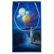 Amazing art design of a starry night sky. A little girl with golden pigtails is walking with an old suitcase in one hand and glowing balloons in the other. Each of the balloons depicts a separate planet in the solar system. This is an image showing the forward looking future this little kid has of where she is headed.
