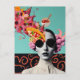 A surreal taco woman collage with a plate of tacos and a bowl of salsa flying around her head