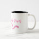 This coffee mug is shown in a breast cancer pink power pink ribbon print.