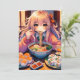 Pretty anime girl eating Ramen noodles with chopsticks and has several plates of sushi. A fun sushi and ramen noodles themed girl's birthday invitation.