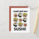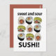 Sushi Sweet and Sour Sushi Postcard original design by Nisha Prabhu. Dive into a delectable world of flavours with our Sushi Sweet and Sour postcard! Perfect for sushi lovers and foodies alike, this vibrant design captures the tantalising essence of your favourite Japanese dish in a burst of colours and creativity. Each sushi piece pops with freshness and zest, making it an eye-catching addition to your collection or a fun surprise for a friend! Whether you're celebrating a birthday, sending a quick note, or just craving a taste of the exotic, this postcard is sure to bring a smile to anyone's face. Ideal for sushi enthusiasts and culinary adventurers.