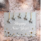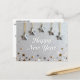 Ring in the New Year with glamorous sparkle! This dazzling design features a rich background of vibrant silver glitter. Elegant white script reads "Happy New Year" beneath five beautiful silver star ornaments hanging from shimmering gold cords.