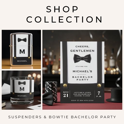 Be a distinguished gentleman with this cool Cheers, Gentleman bachelor party invitation for a groom to be. Designed with formal suspenders and a fancy bowtie, this stationary is perfect for formal or wedding related occasions. Personalize it with his name and event details for a luxury party that will be one to remember.