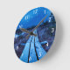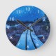 Panoramic view of bog at night with wooden path, small ponds and pine trees. Hiking trail with wooden walkway that goes across the swamp against full moon and night sky with stars.