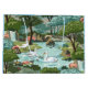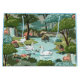 Swans with their baby cygnets swim on a light blue lake in a shady and peaceful pastoral woodland in this tribute to mid century paint by number kits.