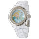Elegant white wristwatch featuring the animated character, Princess Odette - in her human and swan forms - looking at each other, from the classic film The Swan Princess. White feathers mark hours: 3 o'clock, 6 o'clock, 9 o'clock. This design includes The Swan Princess logo.