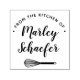 Perfect for chefs, cooks, or bakers, this personalised stamp features "from the kitchen of" and your name in modern calligraphy script lettering with a whisk illustration.