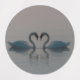 Awesome photograph of two swans swimming head to head creating the illusion of a heart on the water. They are on an early morning misty lake together,