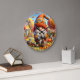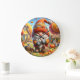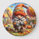 This charming clock features a festive autumn scene with a large, smiling gnome sweeping a pile of fallen leaves. He is wearing a red and orange striped hat and a cosy orange sweater. The gnome is surrounded by pumpkins and squirrels gathering acorns. In the background, there's a cosy yellow house and a sign that reads "SWEATER WEATHER". The clock face is set against a background of autumn colours, all framed within a circular border.