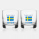 Personalised rocks or whiskey glasses, in a set of two, shows the blue and yellow Swedish flag with the word SWEDEN below, in blue, snow capped letters. Above is a place to add names in blue letters. Each glass can have a different name, or both glasses can have the same name. Cool for a party celebrating Sweden. Lovely housewarming gift for a favourite Swede. Fun to use at clubs, travel groups, and family reunions. Thoughtful Mother's Day or Father's Day gift to celebrate Mum or Dad's heritage.