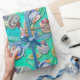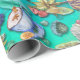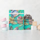 cakes, sweets, and tea with other delicious foods on a bright teal background.