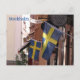 Swedish flags fly from storefronts along a quaint street in Stockholm's Old City.