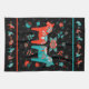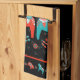 This kitchen towel has a Swedish folk dala horse design with matching folk art flowers in Sweden's flag colours of teal and red on black background. At the top and bottom are a row of matching smaller dala animals and flowers. You can make the background pattern on this kitchen towel smaller or larger.