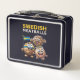 This is a standard metal lunchbox that appears to work just fine. We designed this box ourselves with an uploaded photo and custom text on the front and back. It looks absolutely beautiful except the front of the lunchbox is not centered like it shows in the photo. The print borders don't align with the inset flat part of the box where the preview photo online showed it perfectly centered in there. The back looks nice and centered though.