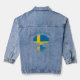 Celebrate your heritage with this stylish denim jacket featuring a tree with roots silhouette with the flag of Sweden fill and "Swedish Roots" curved top text on light grey background.