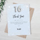A feminine and elegant birthday thank you card for a Sweet 16 party. A light blue, baby blue background colour, with faux silver glitter, sparkles. On front a large hand lettered script and the text: Thank You.