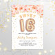 Sweet 16 birthday party invitation. Elegant design in faux glitter gold with floral accent. Invite card with gold number 16 balloons, script font with confetti. Blush coral pink, white. Perfect for a stylish sixteenth bday celebration. Message me if you need custom age.