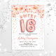 Sweet 16 birthday party invitation. Elegant design in faux glitter rose gold with floral accent. Invite card with rose gold number 16 balloons, script font with confetti. Blush coral pink, white. Perfect for a stylish sixteenth bday celebration. Message me if you need custom age.