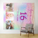 For a Sweet 16, 16th birthday party. A collage of 3 of your photos of herself friends, family, interest or pets. A rainbow, holographic background colour in purple, pink, rose gold and mint green. Decorated with faux glitter drips. Personalise and add her name, age 16 and a date. Date of birth or the date of the birthday party. Purple coloured text. Perfect for a surprise party! Use as a welcome banner, wall decoration or as a photo booth backdrop.