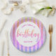 “Happy 16th birthday”. Here’s an unique addition to her birthday fête! Use this stunning, modern, tiny sparkly turquoise blue faux glitter confetti dots and yellow pink orange purple ombre typography script against a light pink and rainbow ombre glitter striped background, paper plate for an event to remember. Personalise the custom text with your guest of honour’s name. Your choice of 2 sizes: 7” or 9”. Guaranteed to add stylish fun to her special party! Matching and coordinating invitations, napkins and other birthday goodies are also available in this trendy and special collection.