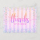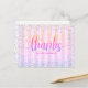 A fun, sparkly way for the birthday girl to show her appreciation to all who supported her milestone event! Send out this stunning, modern, tiny sparkly turquoise blue faux glitter confetti dots and pink yellow orange ombre typography script against a light pink and rainbow ombre glitter striped background, custom thank you postcard. On the front, personalise with her name. Type a custom note and return address on the back. Guaranteed to add a stylish touch to her correspondence! Matching invitations, plates, napkins and other birthday goodies are also available in this trendy and special collection.