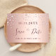 A feminine and glamourous Save the Date card for a Sweet 16, 16th birthday party. A feminine pink, rose gold faux metallic looking background decorated with faux rose gold diamond sprinkle. Templates for a date and your text. Dark rose gold coloured letters. The text: Save the Date is written with a large trendy hand lettered style script.