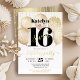 “Happy Sweet 16”. Send out this stunning, simple, festive, modern, personalised real gold foil party invitation for an event to remember. Bold, graphic, black typography and real gold foil handwritten script overlay faux gold balloons and faux gold sparkly string lights on a sophisticated, white background. Personalise the custom text with your daughter’s name as well as other party details. Great for the budding fashionista who loves modern glam and guaranteed to add stylish fun to her special party!