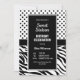 A modern black and white sweet 16th birthday party invitation featuring polka dots and zebra stripes.