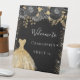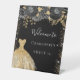 A welcome sign for a Sweet 16, 16th birthday party. A black background with faux gold glitter dust, a golden dress and black roses, florals. Personalise and add a name.