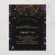 For an elegant Sweet 16, 16th birthday. A stylish black background. Decorated with purple faux gold glitter, sparkles and golden light strings. Personalise and add a name, age and party details. The name is written with a hand lettered style script