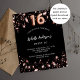 A classic black background, decorated with rose gold stars. Personalise and add a name and party details. Number 16 is written with a balloon style script.