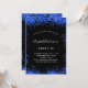 A girly and trendy Sweet 16, 16th birthday party invitation. A chic black background. Decorated with royal blue faux glitter, sparkles. Personalise and add a name and party details. The name is written with a hand lettered style script.