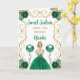 This sweet sixteen birthday card features an elegant gold frame, a beautiful princess with blonde hair and a emerald green dress, flowers and a balloon.