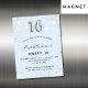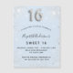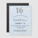 A modern, stylish and glamourous magnet invitation for a girl's Sweet 16, 16th birthday party. A baby blue background, decorated with faux silver glitter, sparkles. Personalise and add your name nad party details. Number 16 is written with a balloon style font, script.