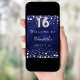 A welcome poster for a Sweet 16, 16th birthday party. A navy blue background with elegant faux silver stars. The blue colour is uneven. Personalise and add a name and text. White letters.