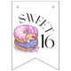 This bunting banner showcases the words "Sweet 16" in a unique print font black letters featuring dounts with filling and sprinkles in this sweet 16 birthday theme and style. All banners have single sided printing outdoor safe made with sturdy plastic polystyrene and thick plastic rope has (16) 5.5" x 8" swallowtail flags on a 6' long string.