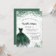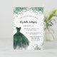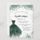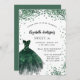 A modern, stylish and glamourous invitation for a Sweet 16, 16th birthday party. On the front: A white background with green sparkles, an emerald green dress. The name is written with a modern hand lettered style script. Personalise and add your party details.