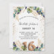 For a Sweet 16, 16th birthday party. A white background decorated with eucalyptus greenery and golden leaves. Golden faux glitter spots. Personalise and add your names and wedding details. Black and golden coloured letters. Number 16 is written with balloon style font.