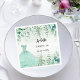 A white background. Decorated with eucalyptus greenery and woodland ferns. Personalise and add a name, date. The name is written with a modern hand lettered style script.