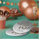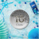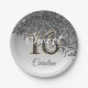A modern black glitter falling on the side of a silver grey gradient background. In the middle, there is a unique 16 glitter number matching the style of the paper plate.
