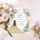 A faux gold looking background. Decorated with white and yellow florals and a golden ribbon. A girl wearing a tiara and a dress. Personalise and add a name and details.
