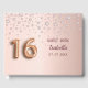 A guestbook for a girly and glamourous Sweet 16, 16th birthday party. A faux rose gold background with pink faux diamonds. Personalise and add a name and date. The name is written in dark rose gold with a modern hand lettered style script. Number 16 is written with a balloon style font.