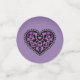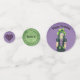 This table confetti has a pretty Goth Girl in green hat with face and arm tattoos wearing green hat on purple background. Medium circles are green with circle of barbed wire and small circles are purple with a Gothic black heart with purple design. Customise your text on all the circles with the templates.