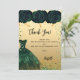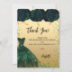 A feminine and elegant birthday thank you card. A faux gold looking background, with green faux glitter, sparkles, green roses and a green dress. On front a large hand lettered script and the text: Thank You.