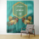 An elegant gold glitter polygon for your text on a green foil pattern backdrop with shiny light green falling glitter and decorative gold glitter party balloons.