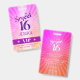 “Happy Sweet 16 Birthday”. Add some extra fun to your favourite Sweet 16 birthday girl’s celebration party whenever you pass out these special birthday VIP pass keepsake badges! Fun, trendy, bold dark hot pink and purple typography with modern sans serif typography overlay a background of pop light orange and pink ombre gradient rays with white dots. On the back, a white sweet 16 graphic overlays a darker hot pink and bright orange pop background. Personalise the custom text with your daughter’s name on the front and the party date, venue and/or other info on the back. Guaranteed to add stylish fun to her special milestone birthday celebration! Matching invites, stickers, plates, napkins and other birthday goodies are also available in this unique and special collection.